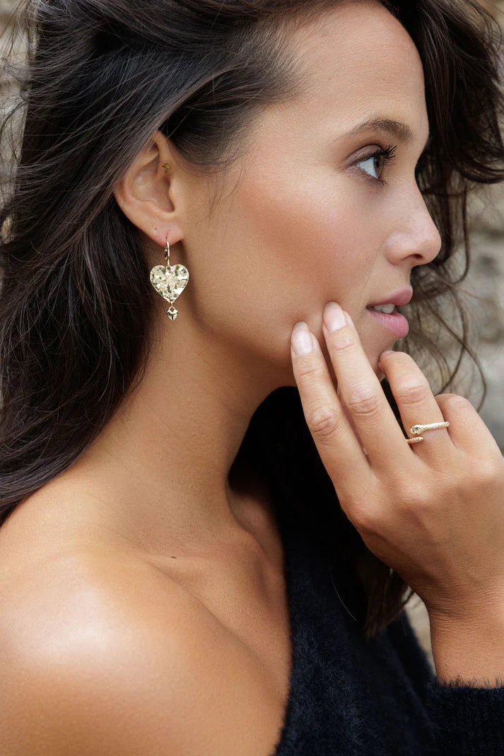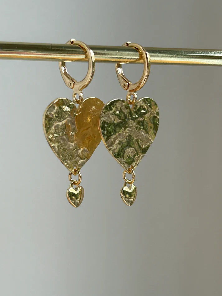 Verguld gehamerd hart met een klein hartje aan een creooltje.