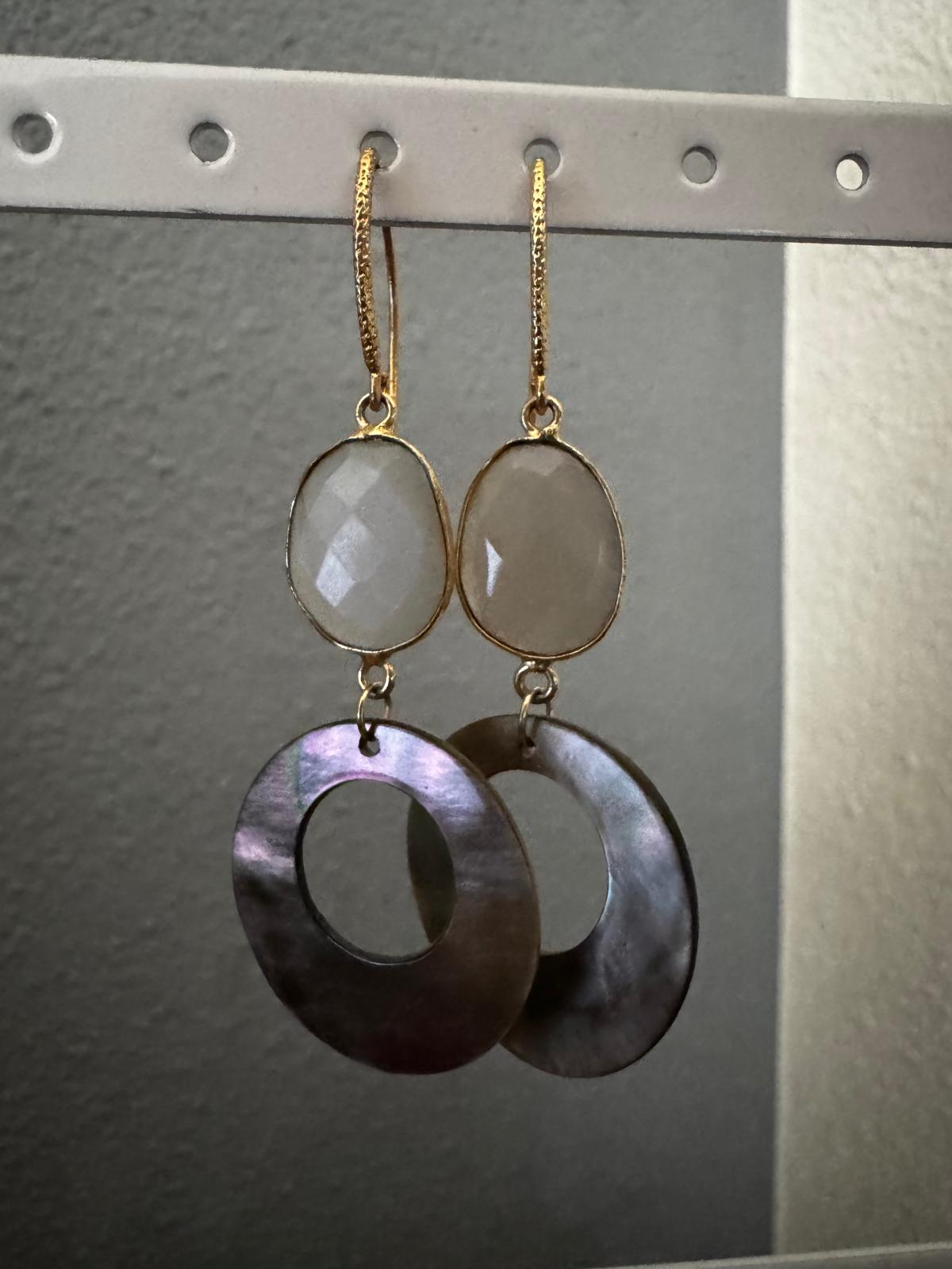 Deze oorbellen combineren een witte Cateye steen met een glanzende parelmoer schelp. Ze roepen direct het gevoel op van warme stranden en zwoele avonden.